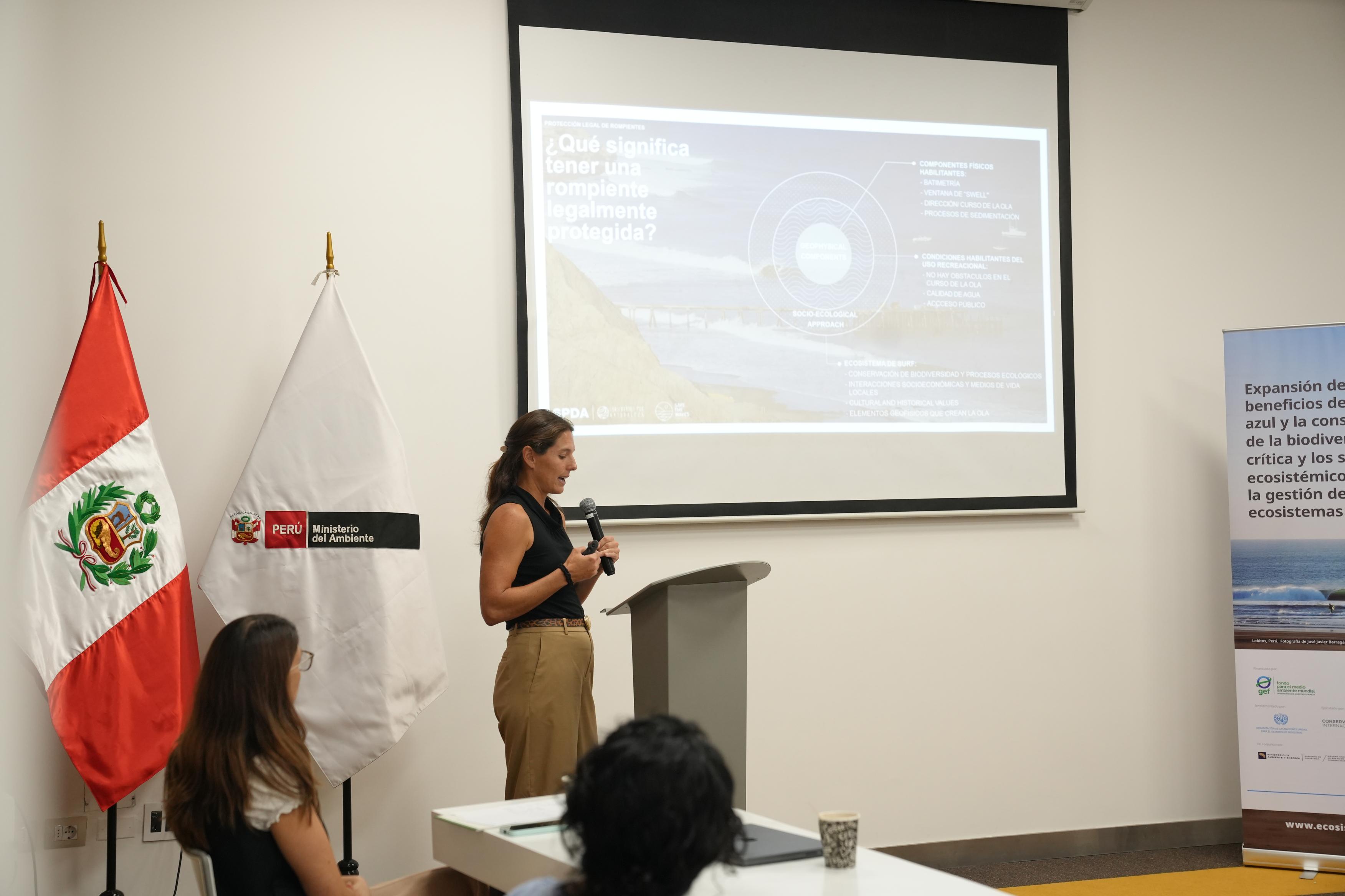 Cynthia Céspedes, gerente del Programa Océano de Conservación Internacional Perú, presentó el proyecto “Gestión de ecosistemas de surf y economía azul”y explicó: